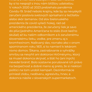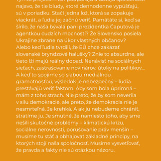 Dezinformácie sú pre mňa zaljimavou témou a fenoménom dnešných dní. V takejto rozšírenej podobe sa nikdy v dejinách nevyskytli. S obľubou hovorím, že predtým sa medzi sebou hádali rodiny, nanajvýš dediny. Dnes je tomu však inak a vďaka moderným komunikačným zariadeniam sa môže hádať celá krajina alebo aj celý svet. Práve počas posledných rokov kedy sme si prešli pandémiou a stále si prechádzame vojnou na Ukrajine, nám ukázali nutnosť riešenia masového šírenia dezinformácií a klamstiev. Vidíme nedostatočné kritické uvažovanie občanov Slovenskej republiky v každom veku. Absencia mediálnej výchovy na mnohých školách nám priniesla zlé ovocie v podobe nepripravenosti mnohých generácií na nový digitálny vek. Našou nádejou môže byť aspoň z vysoká miera angažovanosti mladých ľudí, ktorí vďaka tomu, že od mala vyrastajú s mobilom v ruke, sú schopní skôr odhaliť nepravdy a podvody. A istým upozornením a výzvou na riešenie tohto problému je aj moja práca. Jej cieľom je poukázať na nebezpečenstvá a možno aj výzvy, ktorým v tejto oblasti čelíme a budeme čeliť. Prejav sa zakončuje známym heslom Václava Havla a zároveň aj heslom z námestí počas nežnej revolúcie. Pričom až do dnešných dní sa dezinformačné média snažia vykresliť zmeny v 89. roku ako nepriateľské. Preto záverom sa nesie prianie a odkaz celého demokratického Slovenska a tiež generácií našich predkov, ktorí žili alebo sa narodili počas existencie Československa.